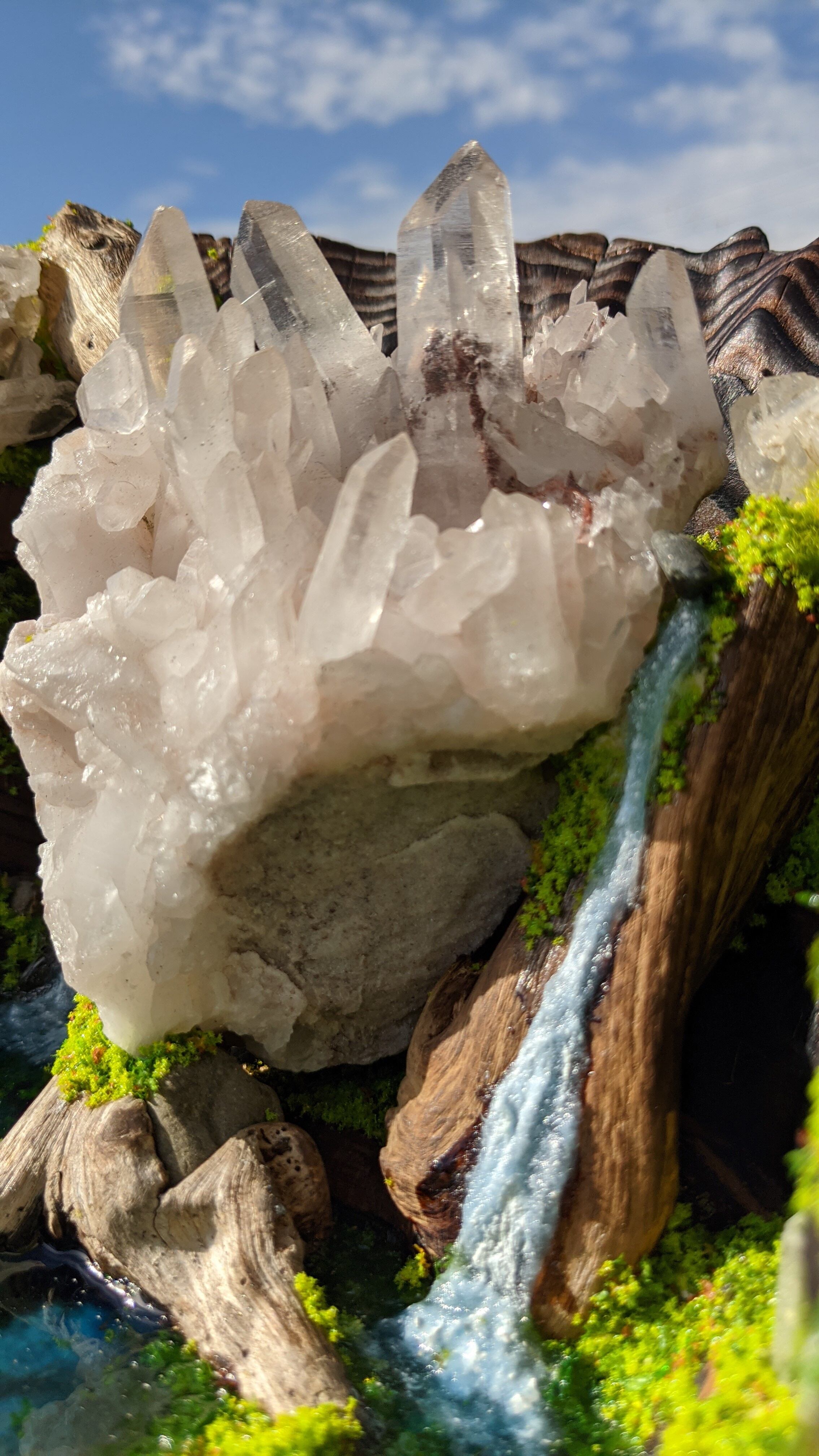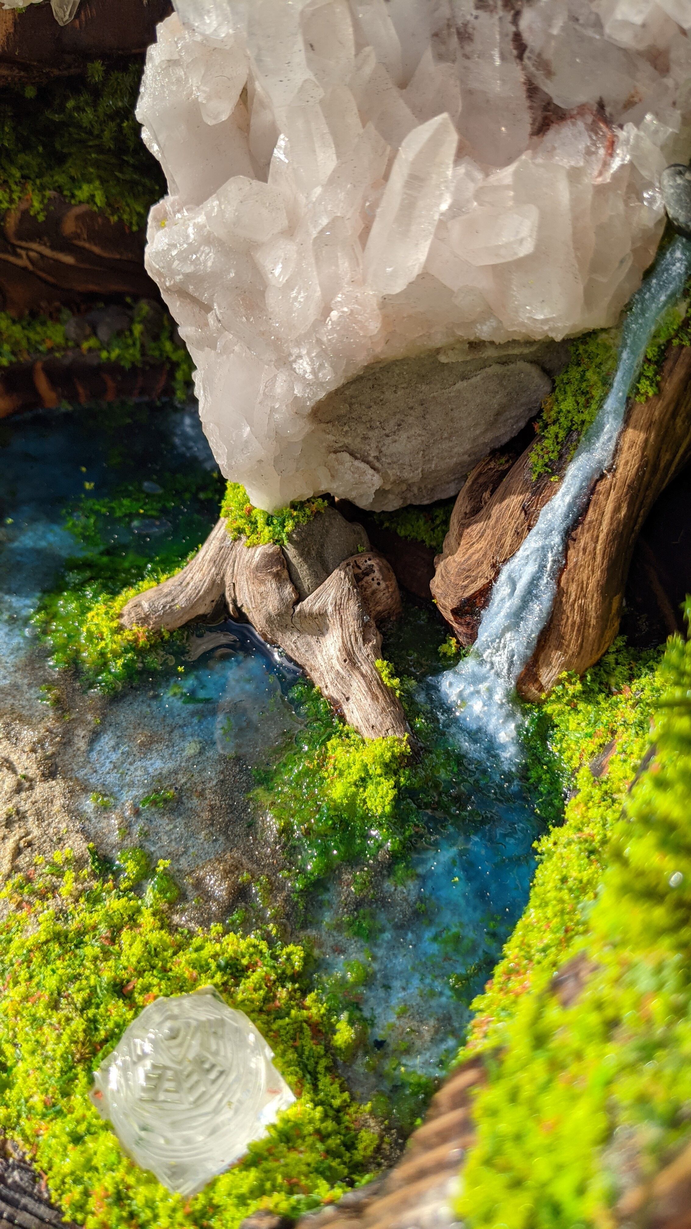 マニカラン水晶(中央)、クル渓谷水晶(上段両端)、水晶彫刻シュリヤントラ(下段手前右側)、水晶彫刻ガネーシャ(下段手前左側)を使用しています。