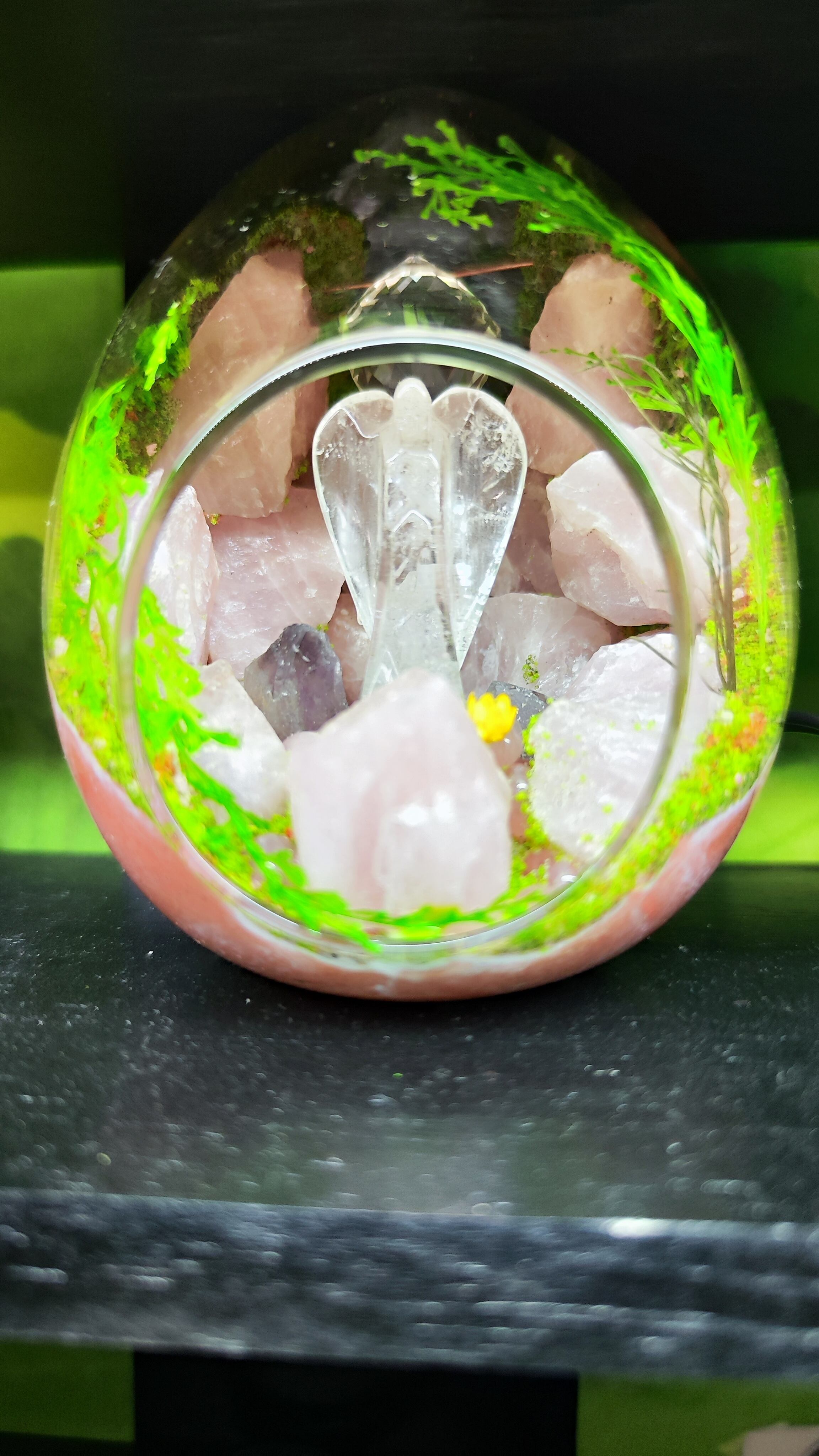 ローズクォーツの原石とレムリアンクリスタルのエンジェル。